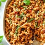 Baked Feta Pasta is a creamy, flavorful pasta dish made with a block of baked feta cheese, cherry tomatoes, sun-dried tomatoes, and basil pesto. The tomatoes burst in the oven to create a rich sauce, which is mixed with cooked pasta and fresh herbs to create a comforting and easy-to-make meal perfect for weeknights or special occasions.