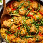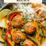 Delight in these flavorful Basil Ginger Meatballs simmered in a rich Coconut Red Curry Sauce. Made with ground chicken, aromatic herbs, and warming spices, these meatballs are seared to perfection and cooked in a creamy red curry sauce with bell peppers, green beans, and a hint of lime. Served over jasmine rice, this dish offers a vibrant fusion of Thai-inspired flavors that make for an irresistible dinner.