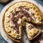 A classic British dessert featuring a crumbly biscuit base topped with rich caramel, sliced bananas, and whipped cream, finished with chocolate shavings for an indulgent treat.