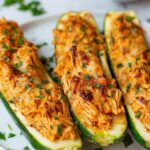 - Fill Zucchini Boats: Spoon the buffalo chicken mixture evenly into each prepared zucchini boat.