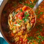 Hearty and comforting Cabbage Roll Soup inspired by classic cabbage rolls, featuring ground beef, cabbage, vegetables, and long-grain rice simmered in a savory tomato broth. Perfect for a warm, satisfying meal.