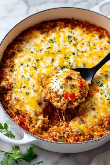 To finish, crumble cooked thick-cut bacon on top if you like that smoky crunch. Plate alongside fluffy baked potatoes or your favorite sides, and dig into this comforting cheesy feast while it’s warm. Trust me, your family will be asking for seconds!