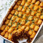Yes! Assemble everything except the tater tots up to 48 hours before baking. Refrigerate tightly covered. When ready, add the frozen tots on top and bake as directed, adding extra minutes if needed.