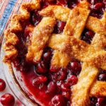 This classic cherry pie recipe features a sweet and tart filling made with frozen tart cherries thickened in a glossy spiced syrup, housed in a buttery homemade lattice crust. Perfect for summer or year-round with frozen cherries, the pie is baked to golden perfection and best served with vanilla ice cream.