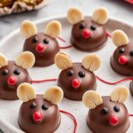 Chocolate Cherry Mice are adorable, festive treats featuring maraschino cherries wrapped in a soft almond-flavored dough, dipped in milk chocolate, and decorated with Hershey’s Kisses, almond slices, and candy details to create cute mouse shapes. Perfect for holiday parties or fun gifts.