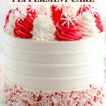 Separate out some frosting to tint red with powdered sugar and gel color; leave the rest bright white (using white color gel if needed). Layer cake, frosting, and crushed candy canes, then crumb coat and chill. Finally, frost the outside smoothly, pipe decorative dollops of red and white buttercream, and add extra crushed candy canes and sprinkles for that festive look.
