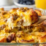 A hearty and delicious Christmas Breakfast Casserole featuring savory ground pork sausage, eggs, sharp cheddar cheese, and day-old bread, perfect for a festive morning meal or holiday gathering.