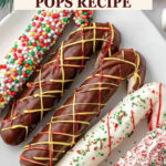 Festive and fun Christmas Marshmallow Pops made by threading marshmallows onto candy canes, coating them in rich chocolate, and decorating with crushed candy canes and holiday sprinkles. Perfect for holiday parties and gifting.