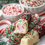 Festive and fun Christmas Marshmallow Pops made by threading marshmallows onto candy canes, coating them in rich chocolate, and decorating with crushed candy canes and holiday sprinkles. Perfect for holiday parties and gifting.