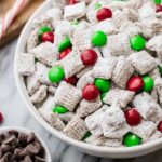 Christmas Puppy Chow is a festive, sweet snack mix combining melted chocolate, peanut butter, and buttery goodness tossed with crunchy rice Chex cereal and coated in confectioners sugar, then sprinkled with colorful holiday M&M's. This treat is quick to make and perfect for holiday parties or cozy snacking.