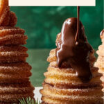 - Assemble and decorate: On a serving platter, arrange for each tree: place a 2 ½-inch churro, stack a 2-inch churro on top, followed by 1 ½-inch churro, then the 1-inch churro on top. Place the smallest fried dollops at the peak. Spoon 2 to 3 tablespoons of chocolate ganache over each tree and decorate with red and green sprinkles and white nonpareils for a festive finish.