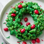 These festive Christmas Wreath Cookies are a delightful no-bake treat featuring crunchy cornflakes coated in a sweet, buttery marshmallow mixture dyed green, then shaped into wreaths and decorated with red candies for a holiday touch. Perfect for holiday parties and easy enough for kids to help make.