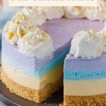 Repeat adding layers in whichever order you like, freezing briefly after each to avoid blending. I learned the hard way that pink and purple don’t contrast well if placed side by side, so plan your color sequence for the best visual wow factor. After all layers are set, freeze the whole pie for 3-4 hours until fully firm.