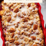 - Prepare Crumb Topping: In a medium bowl, combine brown sugar, flour, and ground cinnamon. Cut in the cold, cubed butter using a pastry blender, fork, or your hands until the mixture becomes crumbly. Stir in the chopped pecans. Evenly sprinkle the crumb topping over the batter in the baking dish.