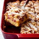 - Prepare Crumb Topping: In a medium bowl, combine brown sugar, flour, and ground cinnamon. Cut in the cold, cubed butter using a pastry blender, fork, or your hands until the mixture becomes crumbly. Stir in the chopped pecans. Evenly sprinkle the crumb topping over the batter in the baking dish.