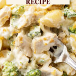 A comforting Chicken Alfredo Bake featuring tender chicken breast, pasta shells, and broccoli, all smothered in a rich homemade Alfredo sauce made with butter, garlic, Parmesan, and Romano cheeses. Topped with gooey mozzarella and an optional crispy Ritz cracker topping, this baked casserole is perfect for an easy family dinner.