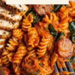 A flavorful and creamy chicken and chorizo pasta dish featuring tender chicken thighs, spicy Spanish chorizo, and a rich tomato cream sauce with Parmesan and spinach. Perfect for a comforting dinner with an Italian-inspired twist.