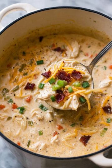 - Serve and Garnish: Ladle the soup into bowls and garnish with additional shredded cheddar cheese, crispy bacon pieces, and freshly chopped green onions. Season with salt and pepper to taste. Enjoy warm!