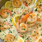 This Creamy Garlic Shrimp recipe features succulent large shrimp cooked in a rich and velvety sauce made with garlic, dry white wine, chicken broth, heavy cream, Parmesan cheese, and fresh lemon juice. It's an elegant and flavorful dish perfect for a quick dinner or special occasion, pairing beautifully with pasta, rice, or roasted vegetables.