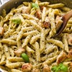 This creamy pesto chicken pasta combines tender chicken, al dente penne, and a rich, cheesy basil pesto sauce all cooked together in a stainless steel skillet for a comforting and flavorful meal that's perfect for dinner.