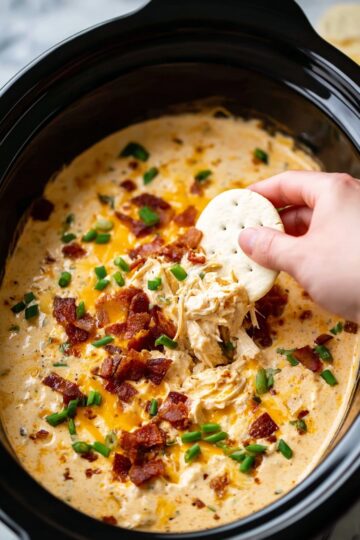 Once the 2 hours are up, give the dip a thorough stir to ensure every cheesy, chicken-y bite is smooth and evenly blended. Then, sprinkle the remaining ¼ cup of chopped cooked bacon and vibrant green onions on top for a gorgeous, tasty finish. This little pop of color and crunch takes the dip up a notch.
