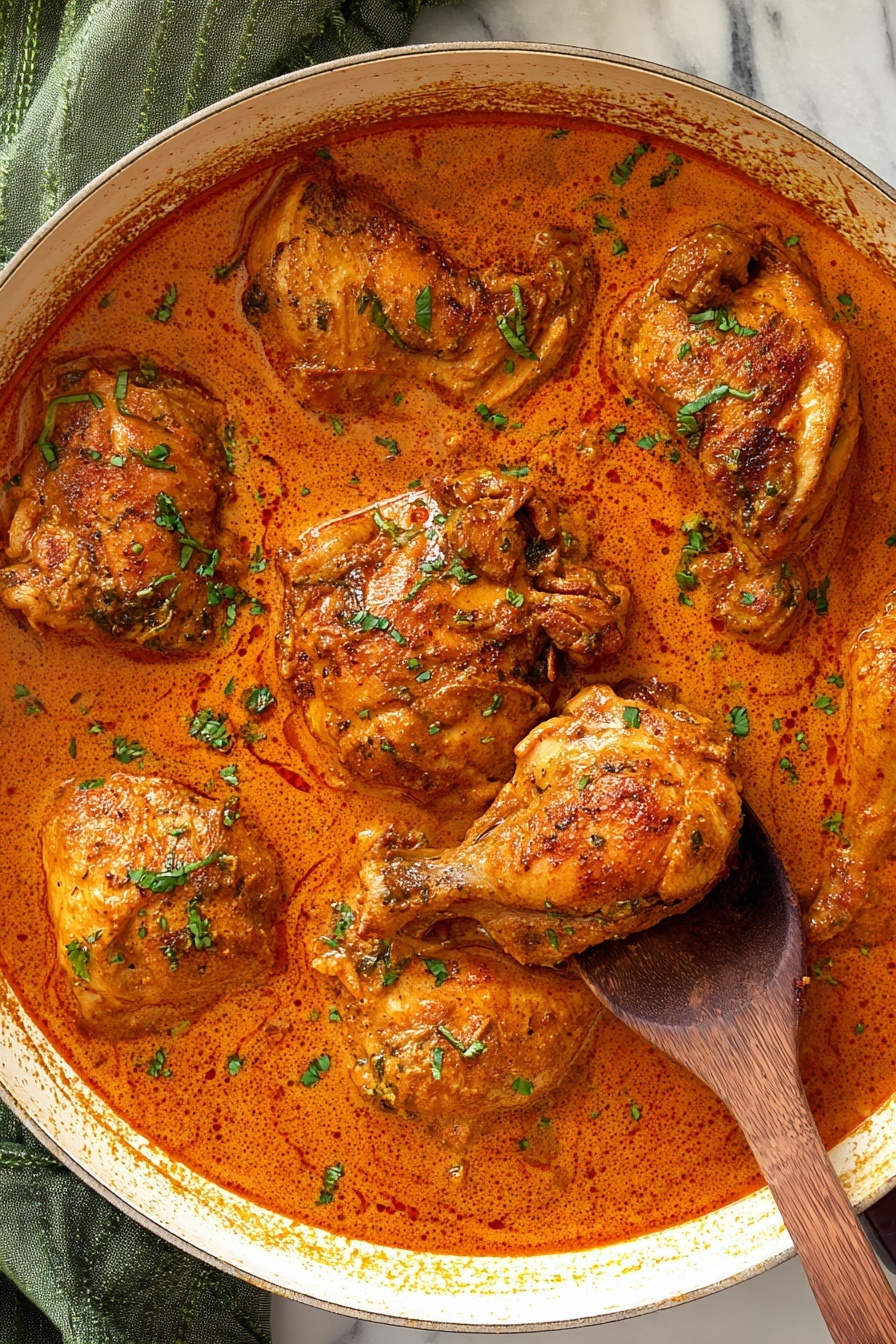 Chicken Paprikash is a comforting Hungarian dish featuring tender chicken thighs and drumsticks simmered in a rich and creamy paprika-infused sauce made with onions, garlic, and sour cream. Perfectly seasoned and garnished with fresh parsley, this classic recipe offers a perfect balance of smoky and sweet flavors.