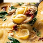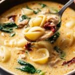 Creamy Tuscan Chicken Soup is a comforting and flavorful dish featuring tender chicken thighs cooked in a rich broth with small pasta shells, parmesan cheese, cream, spinach, and sun dried tomatoes. This soup combines savory chicken, aromatic vegetables, and creamy dairy for a hearty meal perfect for any season.