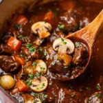 Beef Bourguignon is a classic French stew that features tender beef chuck slowly braised in Burgundy wine with aromatic vegetables, herbs, and savory bacon. Finished with pearl onions and cremini mushrooms sautéed in butter and olive oil, this rich and comforting dish is perfect for special occasions or cozy dinners. The flavors intensify when allowed to rest overnight, making it even more delicious the next day.