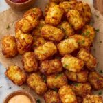 Air Fryer Cheesy Tater Tots are crispy, golden shredded potatoes mixed with sharp cheddar cheese and lightly seasoned, then formed into bite-sized tots and perfectly cooked in the air fryer for a delicious appetizer or snack.