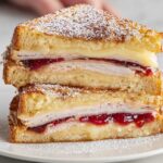 The Monte Cristo Sandwich is a rich, indulgent sandwich combining layers of ham, turkey, and Swiss cheese between brioche or white bread, lightly buttered and dipped in an egg batter, then pan-fried to a golden crisp. Served with sweet red currant jelly and dusted with confectioner's sugar, this classic sandwich offers a perfect balance of savory and sweet flavors in a comforting meal.