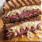 A classic Reuben Sandwich featuring tender corned beef, melty Swiss cheese, tangy sauerkraut, and creamy thousand island dressing, all grilled to golden perfection on dark rye bread. This quick and satisfying sandwich is perfect for a hearty lunch or dinner.