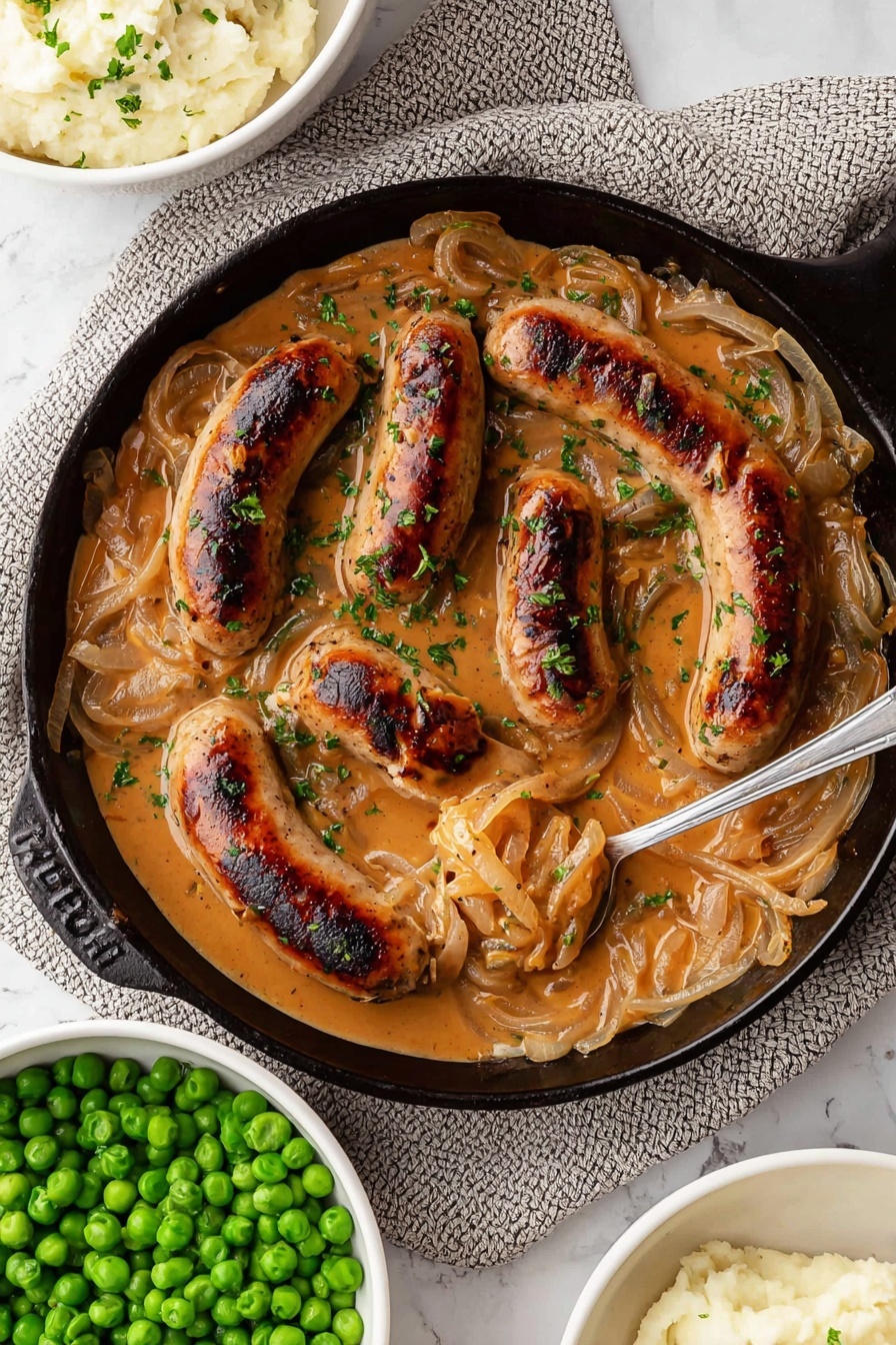 - Serve: Plate the sausages over creamy mashed potatoes and ladle the rich onion gravy on top. Serve with a side of cooked peas for a complete and hearty meal.