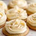 - Pipe Frosting and Garnish. Spoon the frosting into a piping bag fitted with a star tip or a ziplock bag with the corner cut off. Pipe the frosting onto cooled cookies and sprinkle with a light dusting of ground nutmeg, if desired.