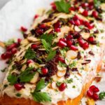 - Assemble: Spread the creamy dill sauce over the salmon in a thick layer (~0.8 cm). Top with holiday tapenade and scatter pomegranate seeds and remaining parsley evenly. Drizzle with lemon juice.