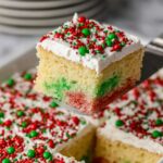 - Decorate and serve: Just before serving, sprinkle red and green sprinkles or holiday-themed decorations on top. Slice and enjoy your festive Christmas poke cake!