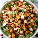 This festive Christmas Pasta Salad combines roasted cinnamon-spiced sweet potatoes, Christmas-shaped pasta, crisp apples, sharp white cheddar, dried cranberries, crunchy walnuts, and peppery baby arugula, all tossed in a tangy balsamic maple dressing. A perfect holiday side dish bursting with seasonal flavors and textures.