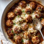 A comforting and flavorful recipe featuring baked ground chicken meatballs infused with Gruyère cheese, served in a rich French onion sauce made with caramelized onions, garlic, and beef broth, topped with melted Gruyère and fresh thyme.