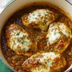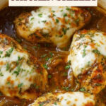 French Onion Chicken is a deeply flavorful dish featuring pan-fried chicken breasts topped with a rich sauce of caramelized onions, white wine, and fresh herbs, finished with melted Gruyere and parmesan cheese. This elegant entree combines savory and cheesy elements for a satisfying and impressive meal.