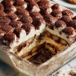 This Gingerbread Tiramisu is a festive twist on the classic Italian dessert, combining the warm spices of gingerbread with creamy mascarpone and coffee-soaked lady fingers for a delicious holiday treat. It features layers of gingerbread-flavored mascarpone cream, gingerbread cookies, and a spiced coffee soak, finished with a dusting of cocoa powder and additional cookies for garnish.