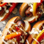 Once the sausages and veggies are ready, it’s assembly time! Pop a grilled sausage into each bun or roll, then generously top with the grilled peppers and onions. Spoon about 2 tablespoons of marinara sauce over each sandwich, and sprinkle with ½ cup shredded mozzarella cheese spread evenly among the four sandwiches.