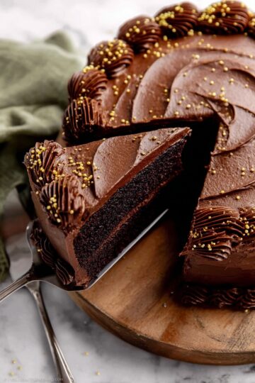- Assemble and frost: If cake layers are domed, level them by slicing off the tops with a serrated knife. Place one cake layer on a serving plate or cake stand and spread about 1 cup (250 g) of frosting evenly on top. Add second layer, frost the top and sides with remaining frosting. Smooth with an offset spatula or bench scraper. Optionally pipe remaining frosting or garnish with gold sprinkles.