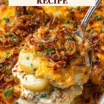 Cover tightly with foil and bake at 350°F (175°C) for about 75-80 minutes, until the potatoes are fork-tender and the internal temperature hits 165°F. The last few minutes, remove the foil, sprinkle fried onions on top, and broil for 1-2 minutes until they’re perfectly golden and crispy. Let the casserole rest 10 minutes so everything settles and the sauce thickens nicely—this makes serving much easier.