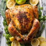 I like to garnish the platter with fresh sprigs of rosemary and thyme, and a few wedges of roasted lemon from the cavity—they add a pop of color and hint at the flavors inside.