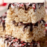Delight in these festive Peppermint Bark Rice Krispies Treats, combining the classic chewy texture of Rice Krispies with refreshing peppermint flavor and layers of dark and white chocolate topped with crushed candy canes, perfect for holiday celebrations.