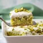 - Frost the Cake: Once the cake is completely cooled, spread the pistachio pudding frosting evenly over the top. Sprinkle with chopped pistachios if desired.