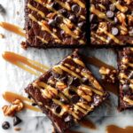 - Frost and Garnish: Once the caramel is set, spread the chocolate frosting evenly over the brownies. Sprinkle the top with the remaining 1/2 cup chopped pecans, 1/4 cup mini chocolate chips, and drizzle with the remaining 1/4 cup caramel sauce for extra decadence.