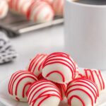 - Drizzle garnish: Lightly drizzle the melted red candy melts in stripes over the coated cheesecake bites using a fork, drizzle spoon, or squeeze bottle.