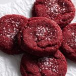 These Red Velvet Cookies are soft, slightly underbaked in the center, and rolled in vibrant red sanding sugar for a festive look. Featuring classic red velvet flavors with cocoa powder and red gel food coloring, they are perfect for holiday treats or any special occasion.