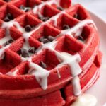 Delicious and festive Red Velvet Waffles served with a rich cream cheese glaze. Perfect for a special breakfast or brunch, these waffles are soft on the inside with a slightly crispy exterior and topped with a sweet, creamy frosting that complements the chocolate and red velvet flavors.