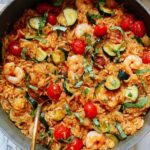 A flavorful Shrimp and Rice Skillet featuring sautéed zucchini, garlic, and Italian seasoning cooked together with tender shrimp and cherry tomatoes in a single pan. This easy and quick meal combines savory tomato paste and chicken broth for a comforting one-pan dinner.